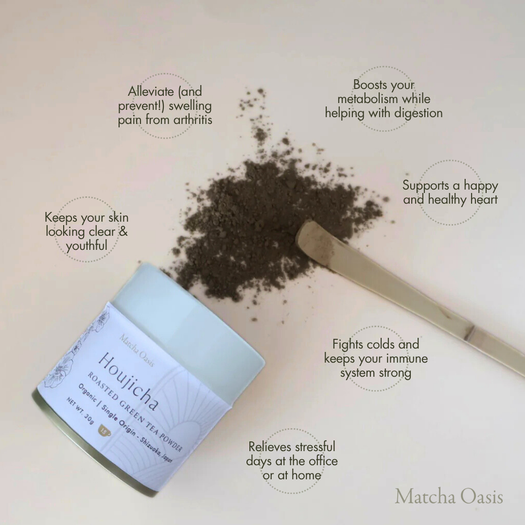 Houjicha Latte: Combine houjicha powder with warm or cold oat milk to create a soothing latte. Sweeten to your preference with honey!